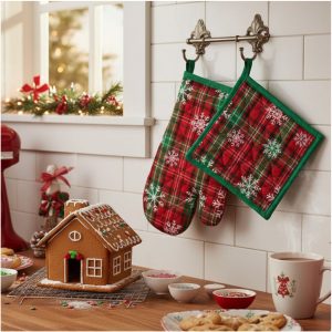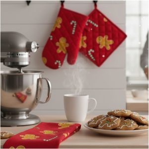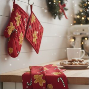 Le fantasie colorate e tipicamente natalizie donano un tocco caldo e accogliente all’ambiente, trasformando ogni ricetta in un momento ancora più piacevole. Il guanto e la presina offrono una protezione ottimale dal calore, mentre lo strofinaccio è ideale per asciugare, pulire o decorare la cucina durante le festività.